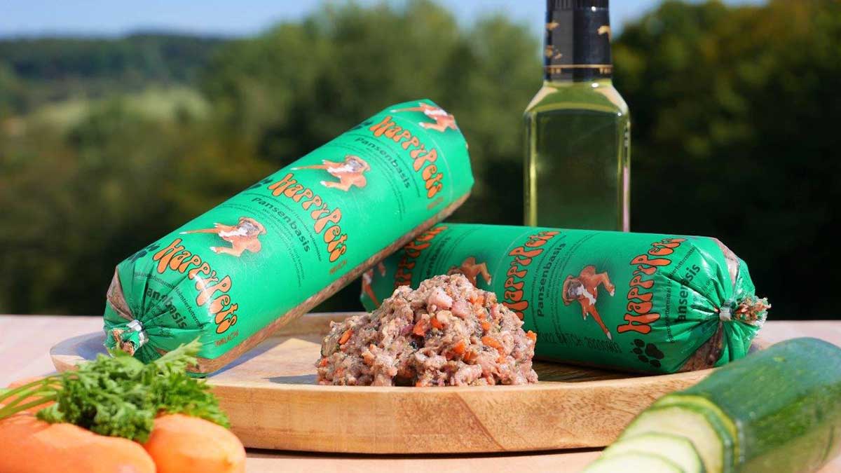 47% grüner Pansen, 30% feingemahlene Hühnerhälse und Karkassen, 15% verschiedene Gemüse saisonaler Anteil wechselnd (Karotten, Brokkoli, Zucchini, Salate), 6,5% Rinderherz, 1% kaltgepresstes Flachsöl (Leinöl), 0,5% Seealgen- und Kräutermischung
